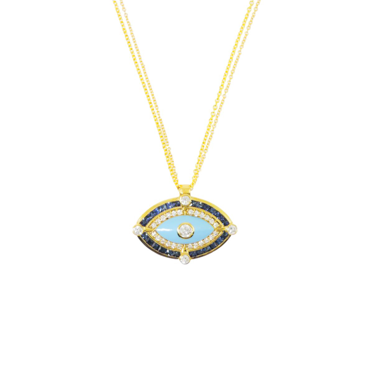 Discover the captivating allure of this gold, sapphire and diamond evil eye necklace crafted in 18K yellow gold. Featuring dazzling blue sapphires and sparkling diamonds, this necklace combines timeless elegance with spiritual protection. The intricate evil eye design is believed to ward off negative energies, making it a meaningful addition to your jewelry collection. Perfect for everyday wear or special occasions, this piece seamlessly blends luxury with symbolism. Elevate your style with this exquisite necklace that showcases exceptional craftsmanship and vibrant gemstones. Designed to be a cherished keepsake for years to come. With the distinction of John Lyras certification.